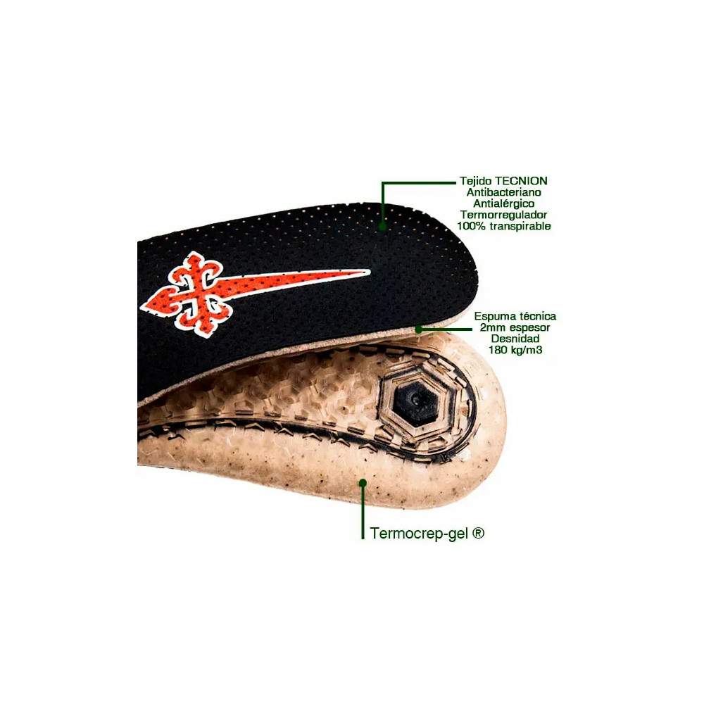 La triple capa de materiales incluye una combinación de espuma de gran densidad y Termocrep Gel®, lo que se traduce en una excepcional capacidad de amortiguación. Además, el tratamiento antibacteriano previene malos olores, permitiéndote mantener tus pies frescos incluso en las condiciones más desafiantes.