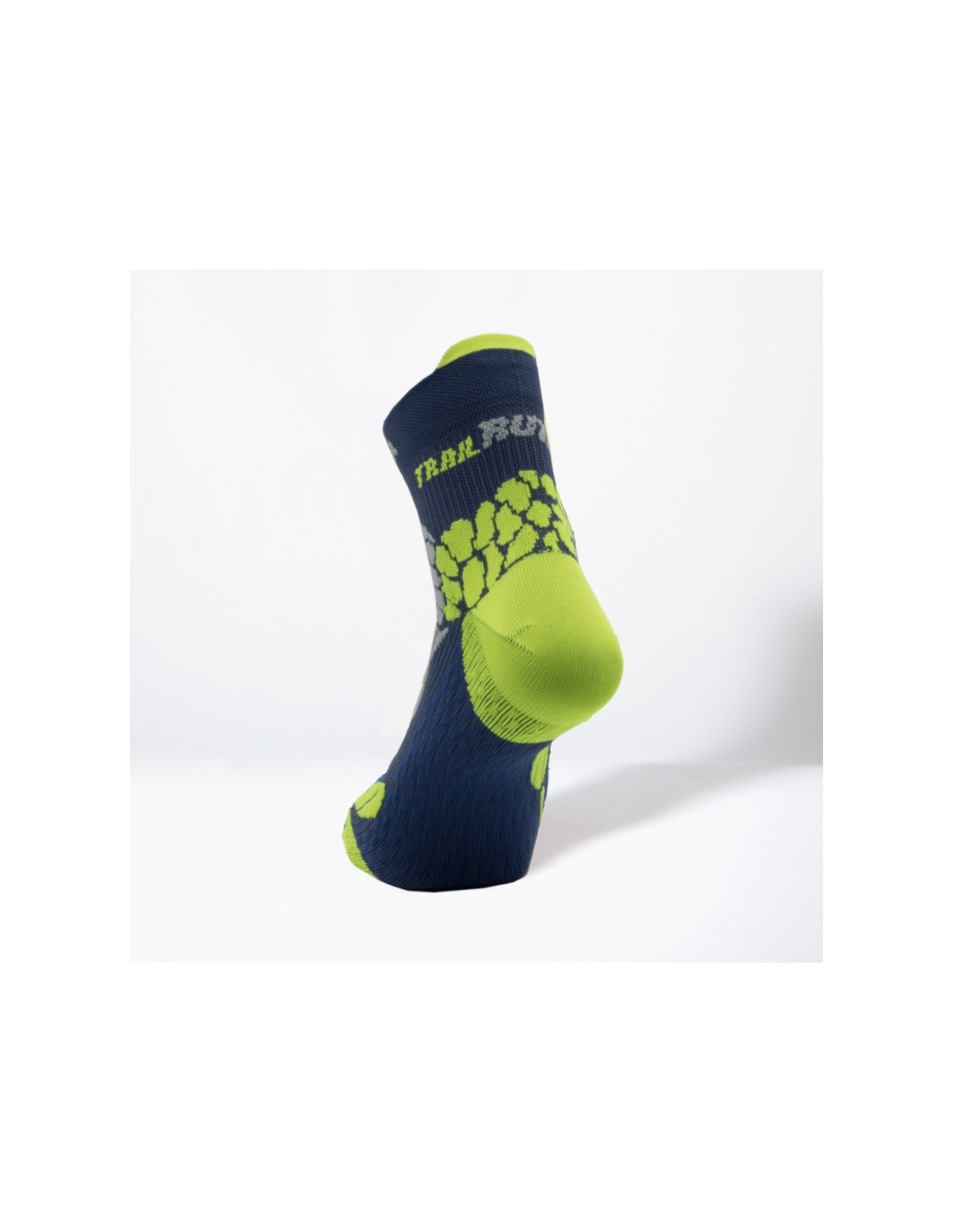 This sock was developed with the specific needs of trail runners in mind. The need for a material that does not absorb water but facilitates its evacuation is paramount. This, combined with the attractive design in blue and yellow tones, not only fulfills an aesthetic function but also provides visibility in low-light conditions, increasing the runner's safety.