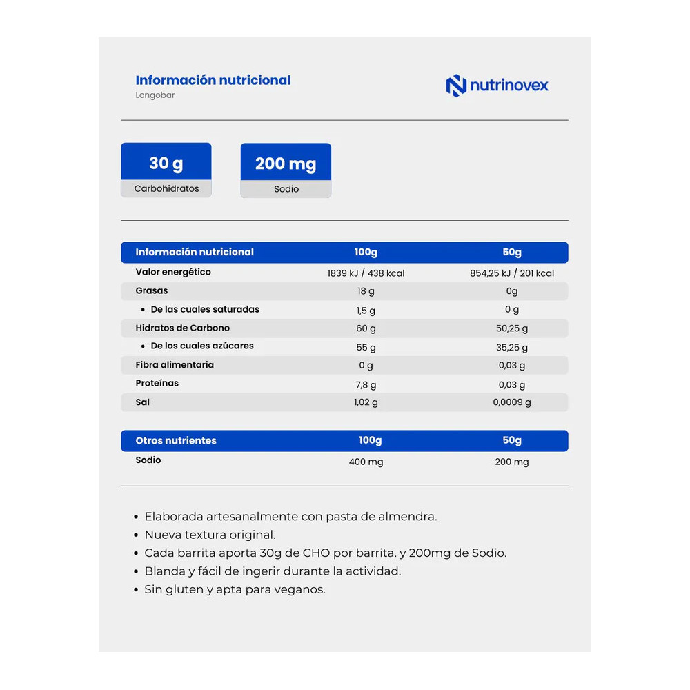 In summary, the Nutrivonex Longobar is not just an energy bar; it is an ally designed with the needs of athletes in mind who want to maximize their performance and recover optimally. Its combination of ingredients provides a practical and efficient solution, helping athletes maintain the energy and hydration necessary to achieve their most ambitious goals. Considering its versatility and formulation tailored to the demands of endurance sports, this bar positions itself as a preferred option among those looking to push their limits to the next level.