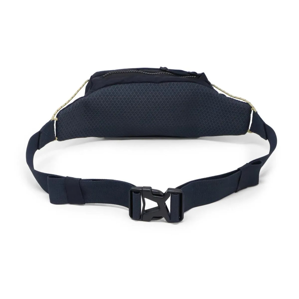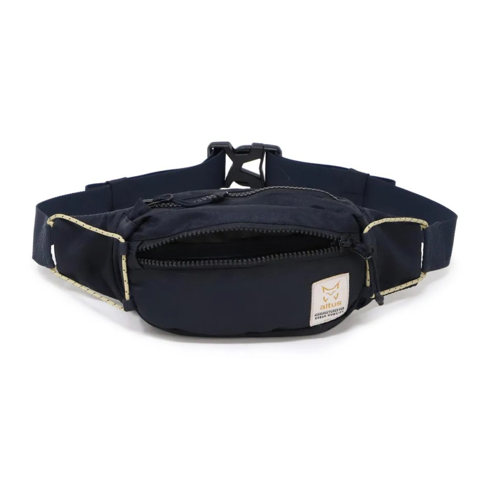 Riñonera polivalente with multiple compartments inside and outside with zipper closures.