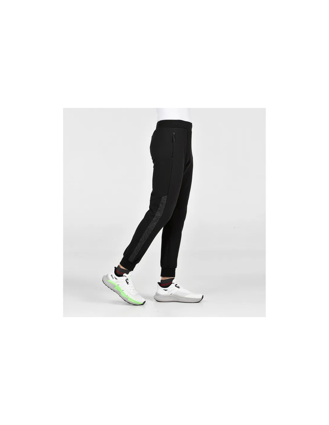El diseño incluye cortes laterales con gráficos estampados que aportan un toque moderno y dinámico, además de un corte posterior ergonómico para máxima libertad de movimiento. Pantalón con puños y cintura elástica ajustable con cordón.