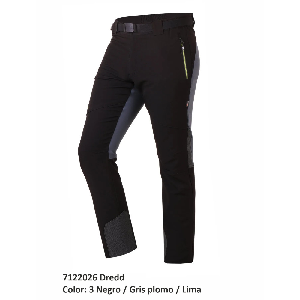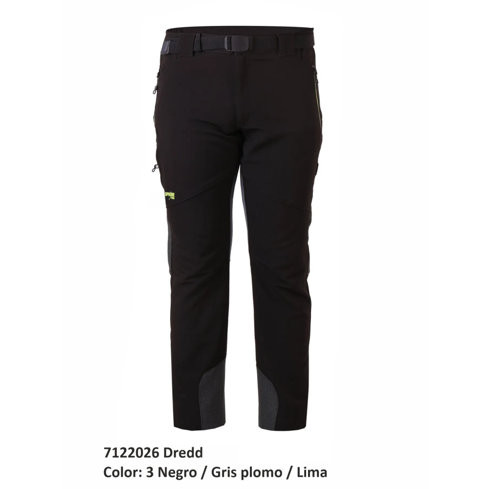 Pantalón corte técnico, cintura semi elástica con cierre de botón corchete y cinturón elástico ajustable, cuatro bolsillos con cremalleras, pinzas en las rodillas, goma ajustable y tejido especial en los bajos. Para senderismo montaña.