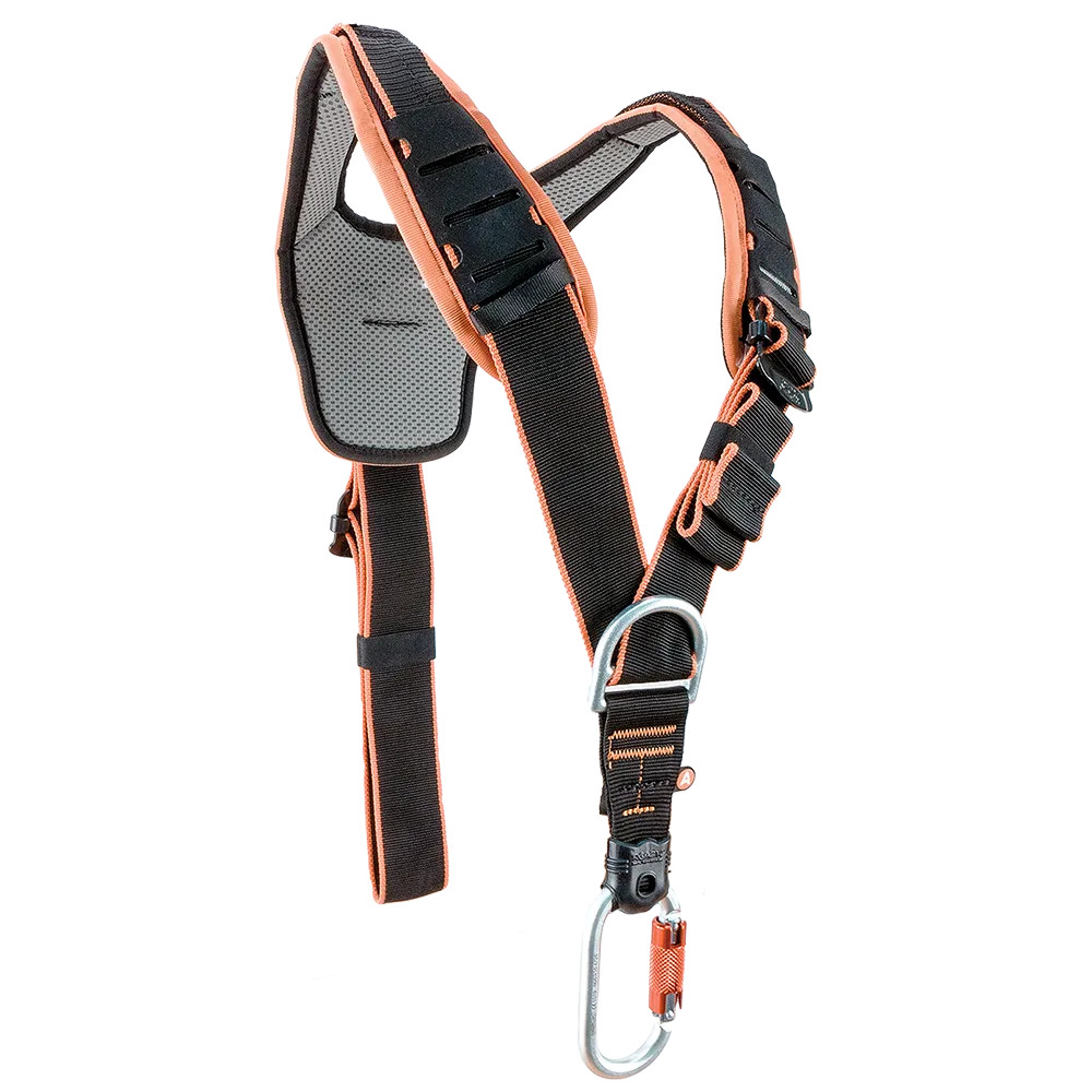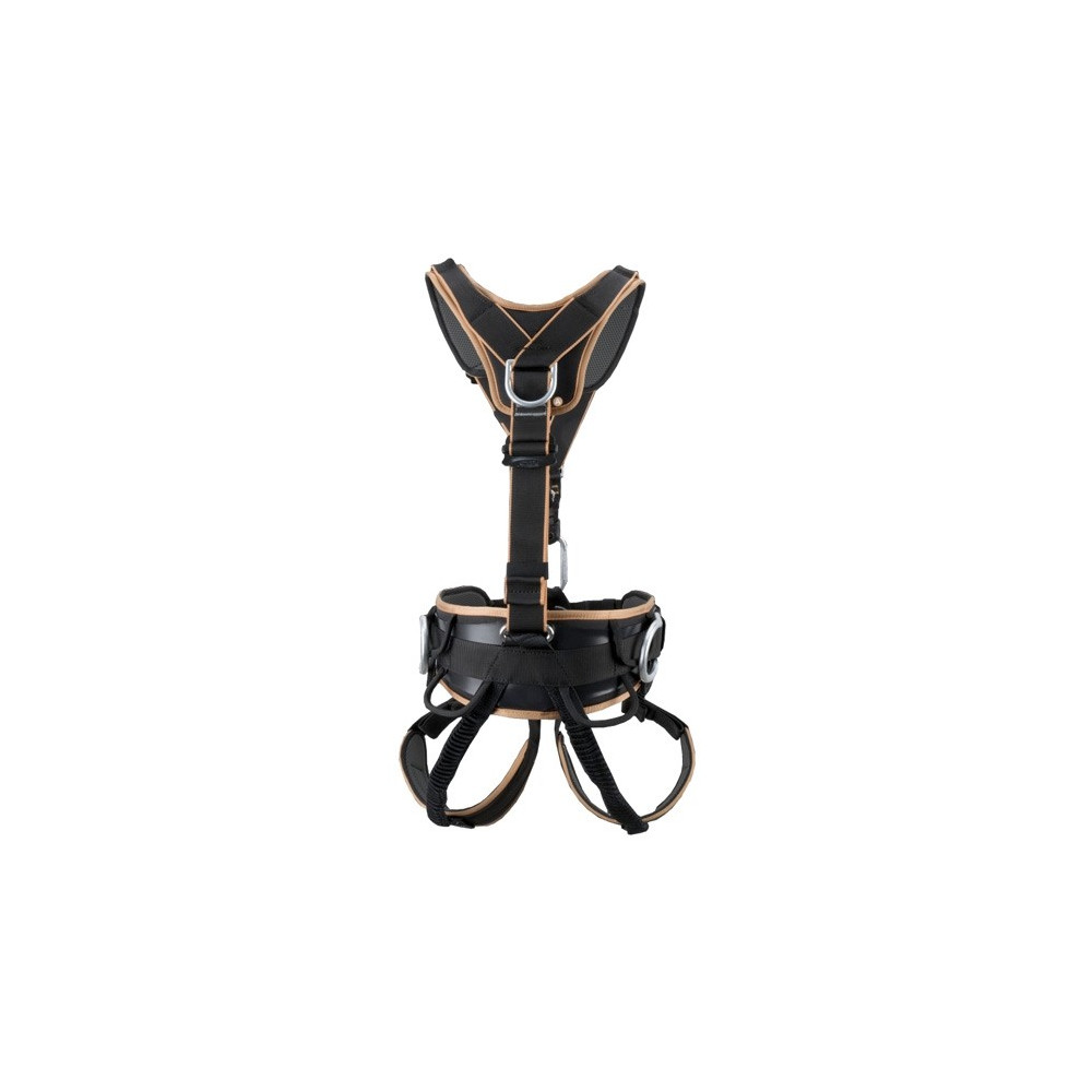 A sua inovadora parte frontal inclui duas alças têxteis reforçadas, melhorando a ancoragem e a conexão com dispositivos de descida. As fivelas rápidas de aço permitem um ajuste preciso, enquanto as correias elásticas automáticas asseguram um posicionamento ótimo. Com um peso aproximado de apenas 2.400 g, é leve sem sacrificar a robustez.